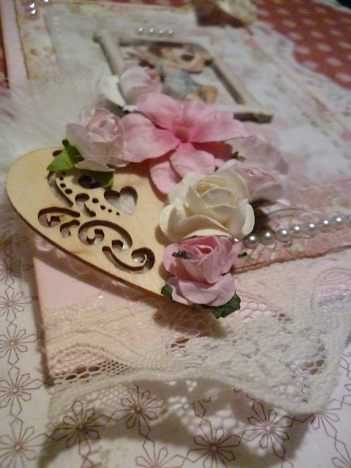 El marco era color craft y he aplicado gesso para que se integrara en la composición. El angel pegado con volúmen.Termina la composición una puntilla Vintage en color crudo y diseño de rosas a juego con el papel. Perlas rosas en otro de los extremos de la tarjeta. En la esquina superior de la imagen he sellado "Sent with love"(aunque no se aprecia mucho).