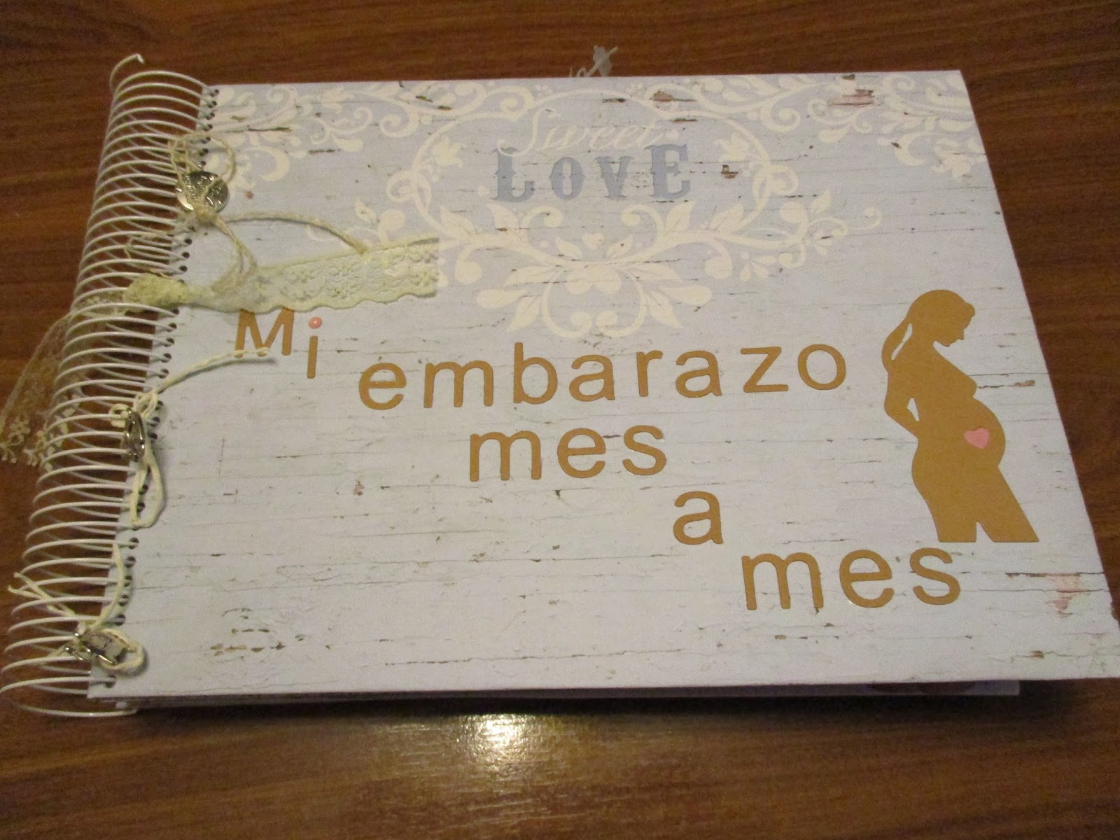 Decoré la encuadernación con tres charms: un elefante con la trompa hacia arriba, una herradura, una chapita con la leyenda " la vida es bella", una puntilla en color vainilla.