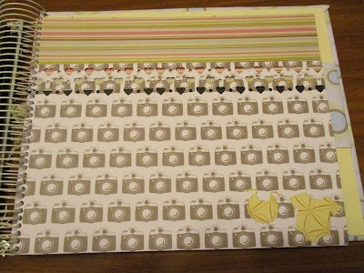 El bolsillo, lo he troquelado con una cenefa de corazones. En una de las esquinas, el otro troquel que compré, un peto y un babero en tonos amarillos.