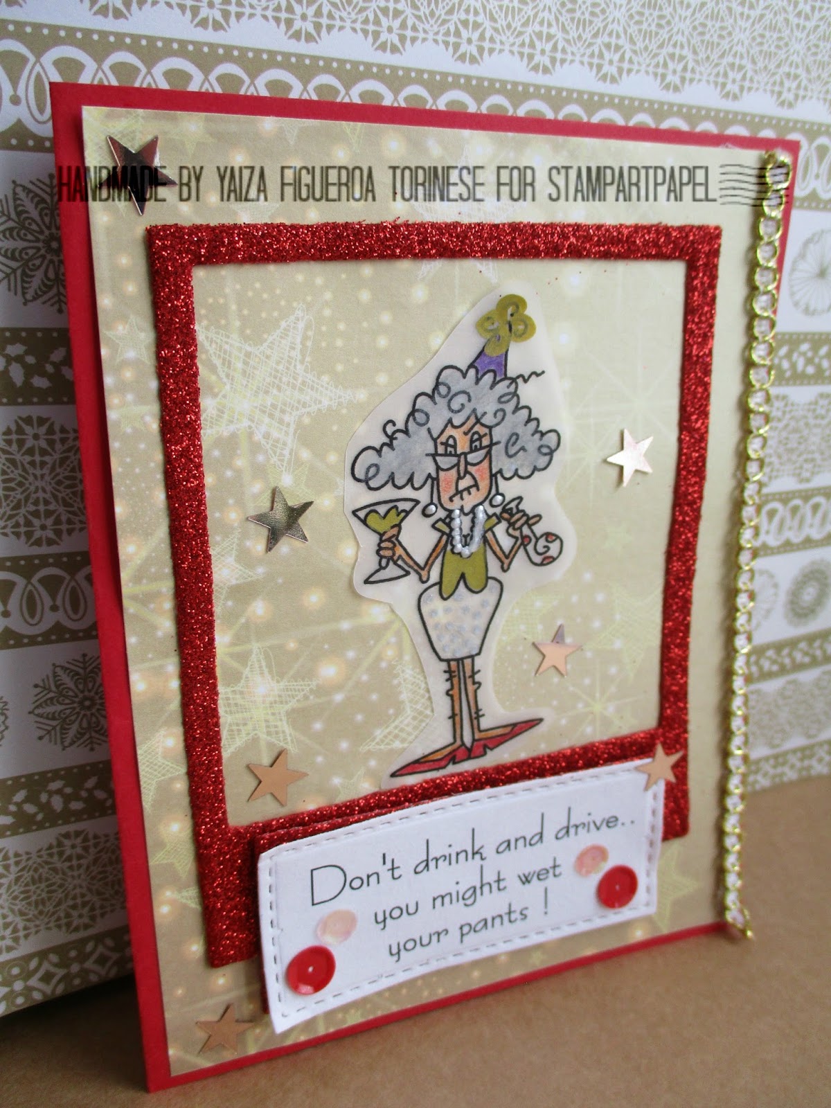 Un bolsillo embossado, al que he colocado un tag con unos sellos a juego, puntilla blanca con topos en dorado y medias perlas blancas en una de las esquinas.
